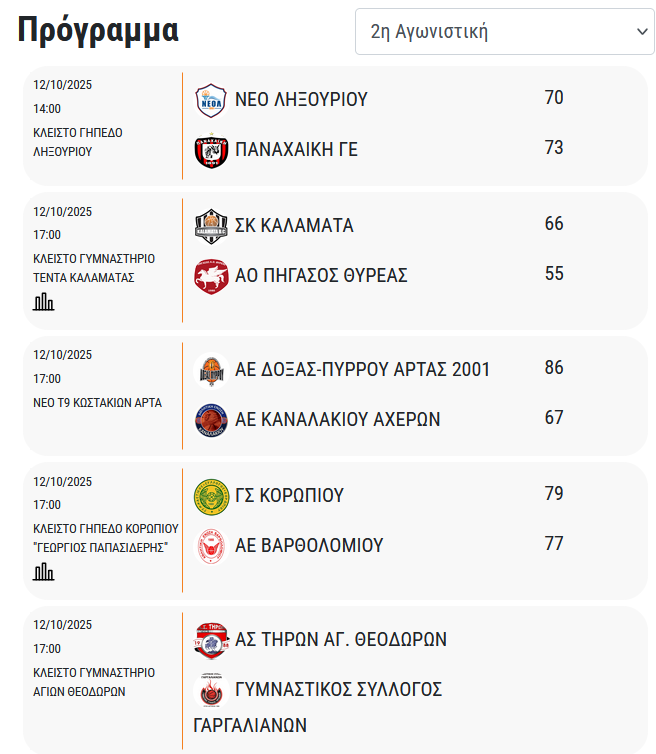 1η | 5/10/2025 | Α.Ε. ΚΑΝΑΛΑΚΙΟΥ | Γ.Σ. ΚΟΡΩΠΙΟΥ | 87 - 79 |